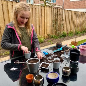Met mijn handen schep ik de potgrond uit de zak, die de meiden gebruiken om hun potjes te vullen. Ze leggen er zaadjes op en dekken die toe met een dun laagje extra aarde. Hun enthousiasme werkt aanstekelijk, prompt stel ik voor ook vast wat zonnebloemen te zaaien, die we later in de tuin kunnen zetten. Zolang vieze handen zulke blije gezichten opleveren, vind ik het leuk.