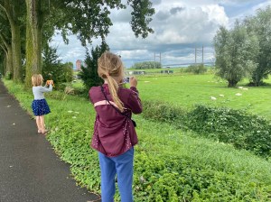Nu zijn we met zijn drieën buiten op pad. Het rondje dat we wel vaker gelopen hebben, blijkt door het oog van de lens veel interessanter dan gewoonlijk. ‘Deze bloemen zijn zo mooi!’ verzucht de jongste. ‘Mogen we ook foto’s maken van die paarden daar?’ vraagt haar zus.