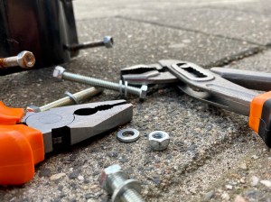 Hier sta ik dus, tamelijk onhandig te pielen met tangen en sleutels. Eigenlijk weet ik helemaal niet welk gereedschap je het beste gebruiken kunt om al die bouten en moeren los te krijgen. Met één tang lukt het niet, daar was ik al gauw achter, maar of ik nu de meest logische combinatie te pakken heb? Geen idee.
