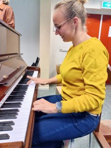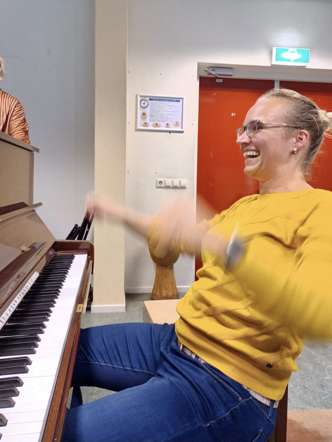Inmiddels ben ik verhuisd naar een andere piano en zit ik in dezelfde ruimte als mijn collega’s. Zij hebben het hele nummer ingestudeerd, ik slechts één lijntje, maar ik ken míjn noten. Nu komt het erop aan. Mijn collega zit naast me en telt zachtjes mee. Precies op het juiste moment vallen we in. Pling – pling – pa – da – da – ping – ting…