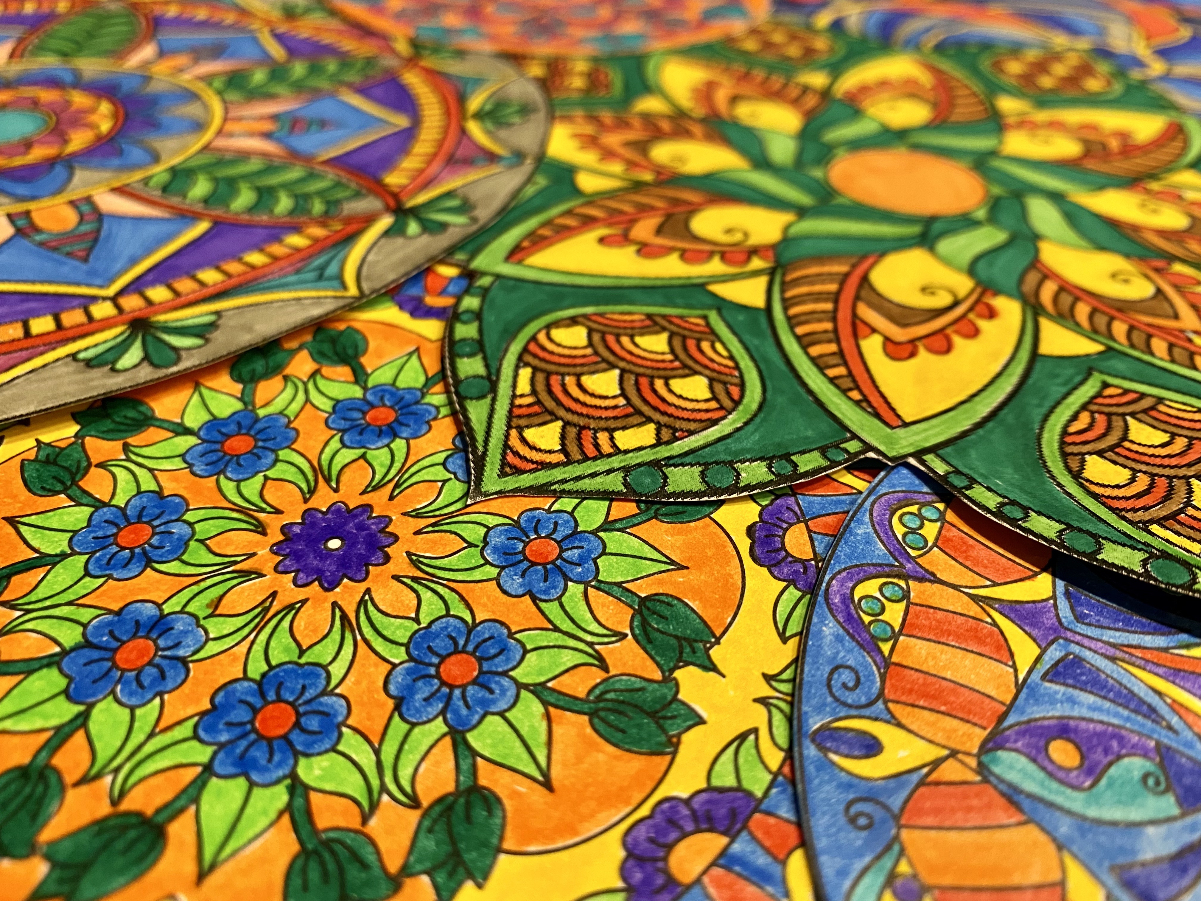 Terwijl ik naar de muziek op de radio luister, zit ik met een viltstift in mijn hand gebogen over mijn mandala. Met voorzichtige, nette streekjes kleur ik de vakjes, bolletjes en bloemetjes in die op het papier gedrukt staan. Het is al de vijfde of zesde tekening die ik van kleur voorzie, maar ik heb er nog lang geen genoeg van.