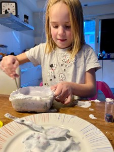 De meiden voegen steeds meer ingrediënten toe. Ze roeren en kneden dat het een lieve lust is en de hele kamer ruikt naar fris-zoet scheerschuim. De tafel wordt steeds witter en de kleren van de meiden krijgen langzaamaan dezelfde kleur. ‘En toch is het niet stretchy genoeg. Ik denk dat het aan de lenzenvloeistof ligt. Heb je wel de goede, mam?’