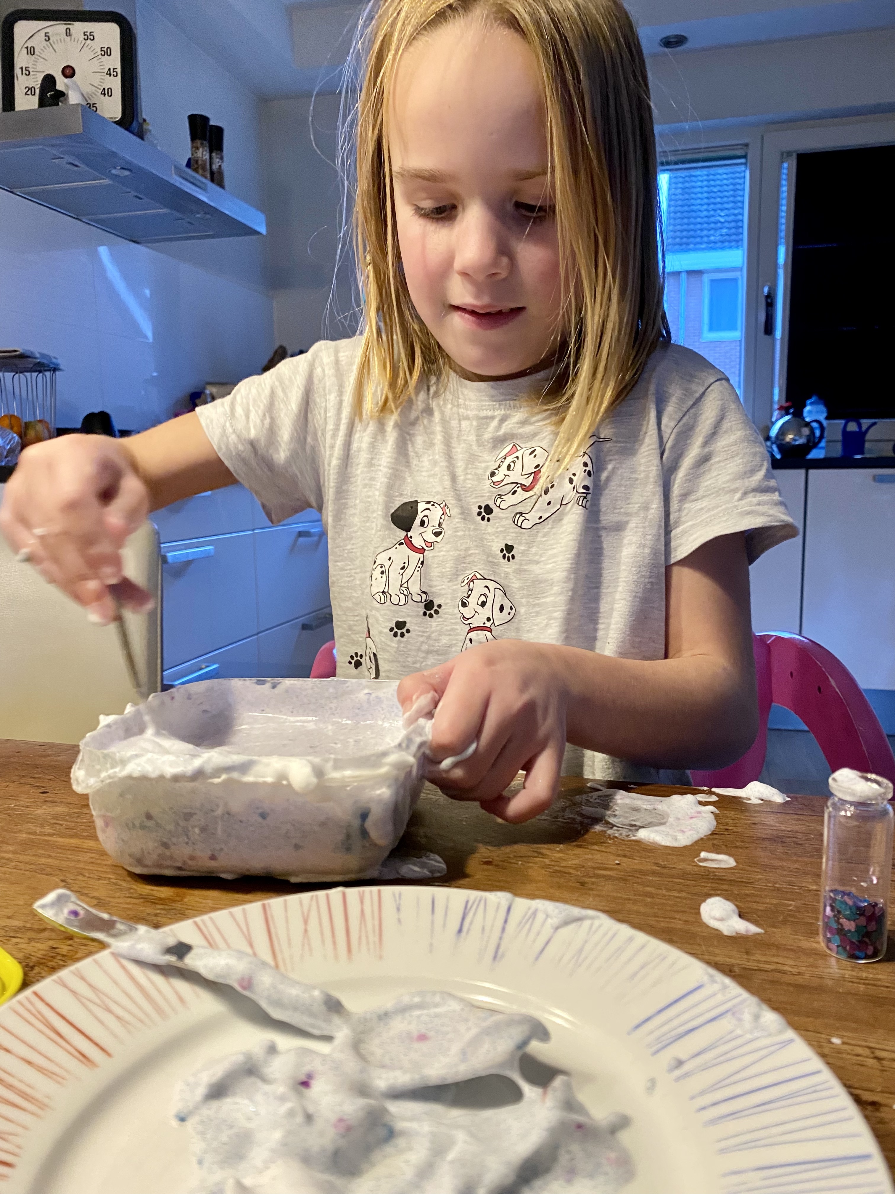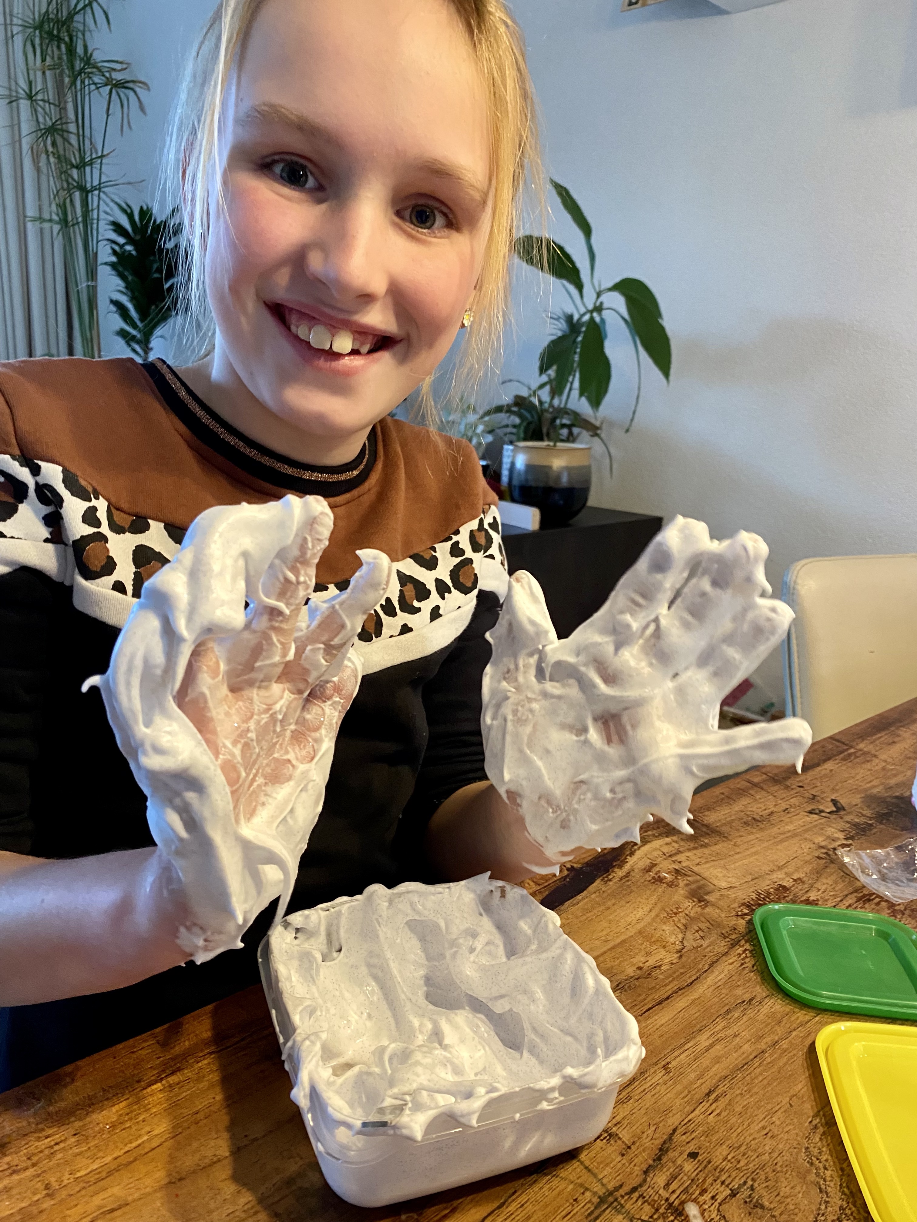 De meiden voegen steeds meer ingrediënten toe. Ze roeren en kneden dat het een lieve lust is en de hele kamer ruikt naar fris-zoet scheerschuim. De tafel wordt steeds witter en de kleren van de meiden krijgen langzaamaan dezelfde kleur. ‘En toch is het niet stretchy genoeg. Ik denk dat het aan de lenzenvloeistof ligt. Heb je wel de goede, mam?’