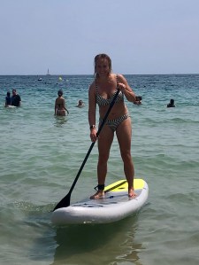 Vorig jaar, toen ik ook in Spanje was, heb ik voor het eerst gesupt. Of beter gezegd: een poging daartoe gewaagd. Mijn zus deed het voor. Ze klom vanuit de zee op het board en peddelde zó weg.