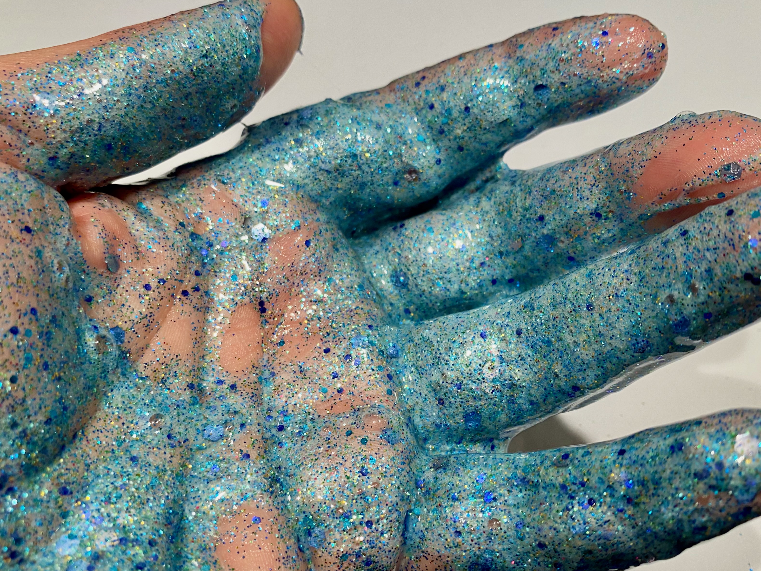 Al gauw zat alles onder de glitters. Niet alleen de handen en het slijm, maar ook de meiden: hun kleren, haren en gezichten blikkerden. Ze straalden, letterlijk en figuurlijk.