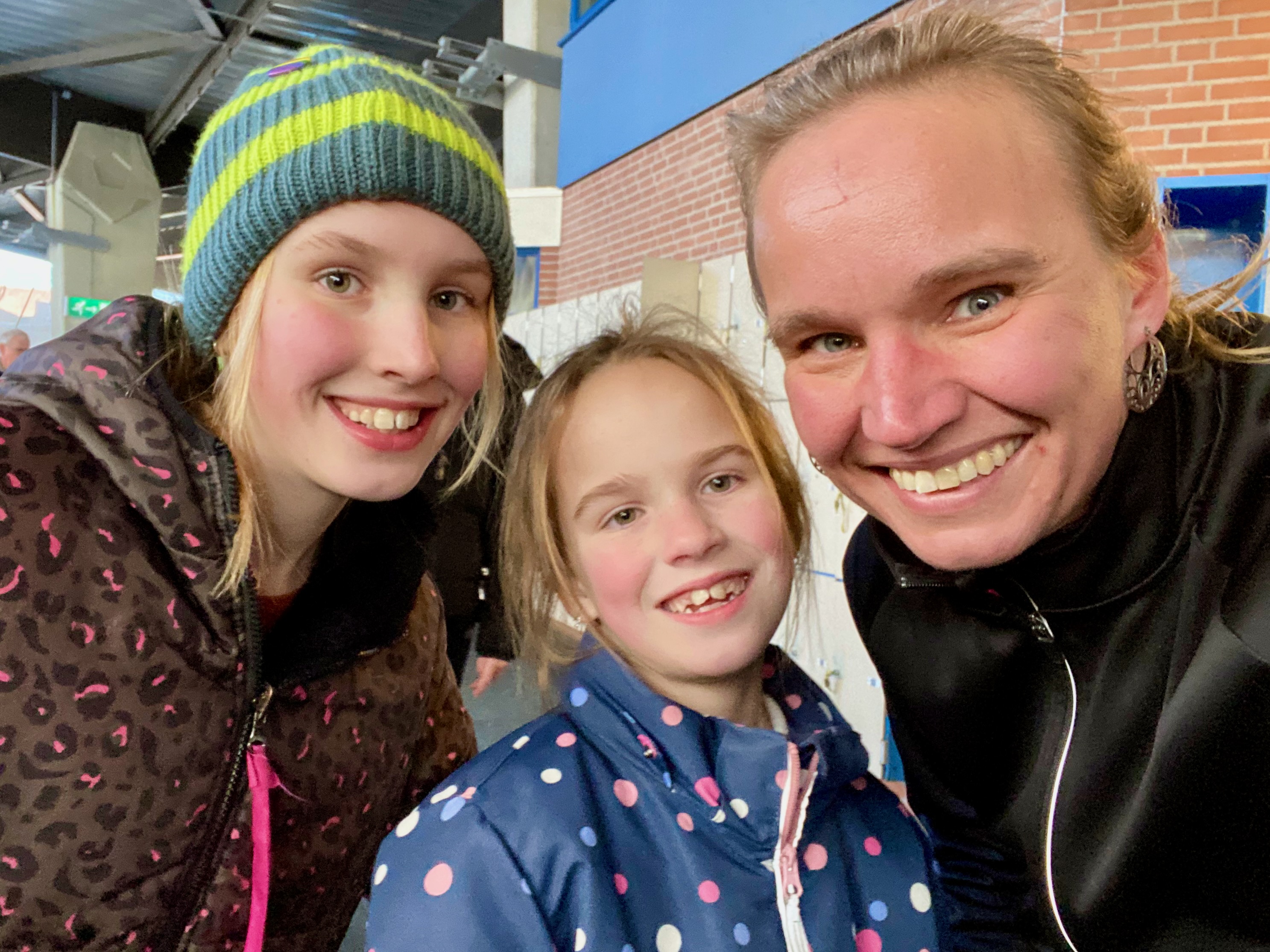 Tijdens het dweilen nemen we een korte pauze. De meiden drinken ranja en eten ontbijtkoek. Al ruim voor de baan weer vrijgegeven wordt, staan ze klaar om het ijs op te gaan. ‘Wij kunnen wel even samen schaatsen, mam,’ stellen ze voor, ‘dan kun jij even zelf.’