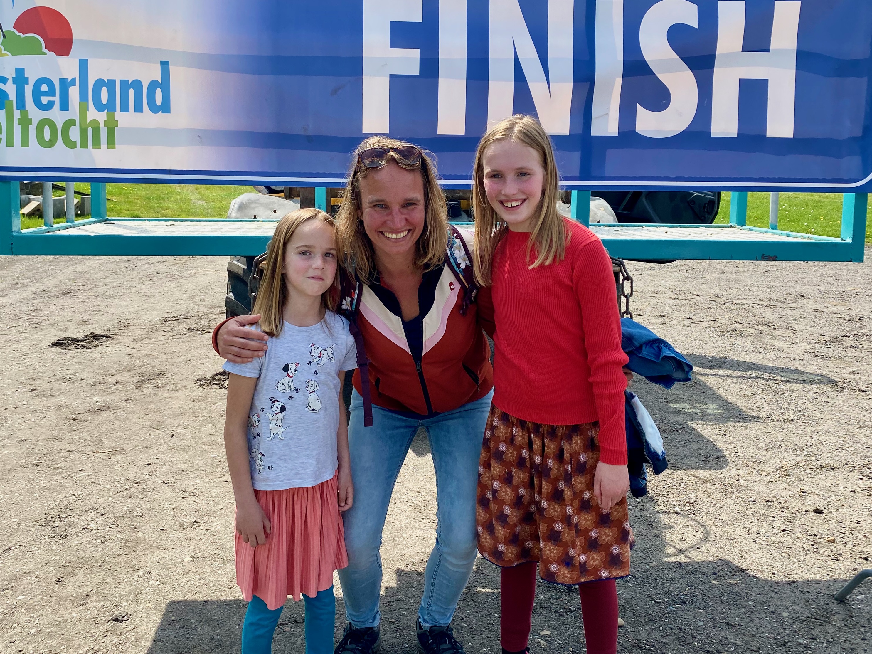 Met die onverwachte, stomme tranen in mijn ogen wandel ik er, samen met mijn meiden, in een rechte lijn naar toe. Ik loop over van liefde en trots. Ze hebben echt wel afgezien, allebei, maar ze hebben het toch gedaan. Ik knuffel de oudste en zoen de jongste, slik mijn tranen weg. Dan gaan we naar de bus die ons terugbrengt naar het startpunt. En naar de medaille, die we zo hebben verdiend.