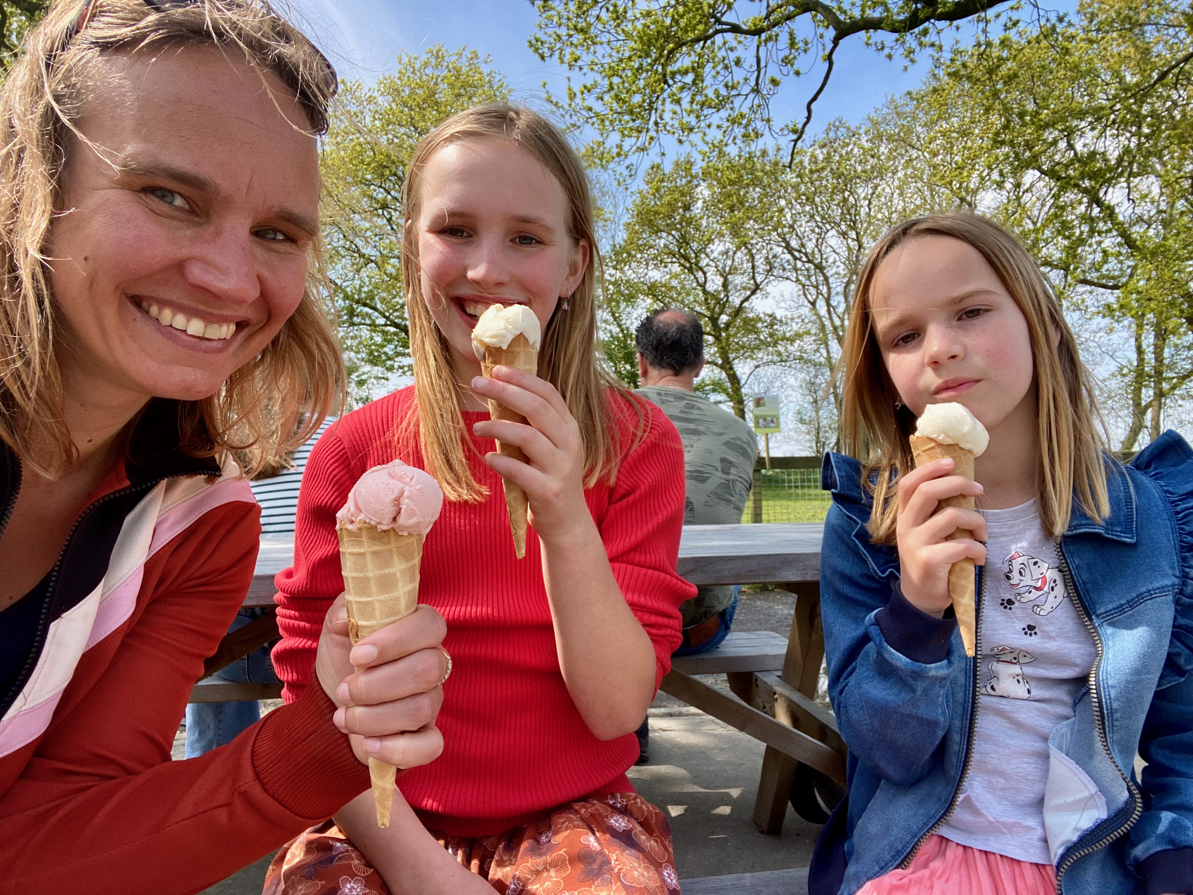 Na een paar kilometer ging het tempo wat naar beneden. Het enthousiasme bleef aanwezig, maar werd door de zere benen toch enigszins getemperd. De jongste keek uit naar een bankje om even te pauzeren. We waren er net meerdere gepasseerd, maar kwamen er nu natuurlijk geen meer tegen. Lopend aten we een boterham en ik hield mijn meisje voor dat we op de ‘echte’ rust, bij een ijsboerderij, zeker zouden kunnen zitten.
