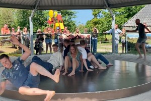 Het is een raar spel: met zijn allen op een grote houten draaischijf gaan zitten en wachten tot je eraf wordt gezwiept. Om het plateau ligt zand, maar ook daarin kun je raar terecht komen; het is geen fabeltje dat er hier al vaker botten zijn gebroken. Toch oefent de schijf een bijzonder soort aantrekkingskracht uit. Niet alleen op kinderen, trouwens.