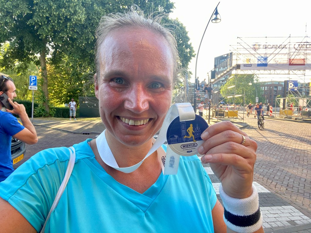 Terug in het centrum herken ik de route. Wat een fijn idee dat ik straks meteen linksaf mag slaan naar de finish en dat ik niet nóg twee rondes hoef. Ik tel de meters hijgend af, zet op het laatste stukje nog even aan en neem na 6,4 kilometer tevreden mijn medaille in ontvangst. Toegegeven: de halve is mooier. Maar wat ben ik blij dat ik daar dit jaar niet aan meedoe.