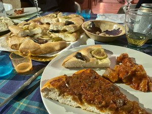 Al gauw vulde de gastvrouw onze tafel met mij onbekende, maar heerlijk uitziende gerechten. Brood met vijgen, vlees, noten en salades. Haar man toverde kleine glaasjes en flessen likeur tevoorschijn: tijd voor shotjes. We proostten voor we ze achterover sloegen, eerst de witte, dan de roze.