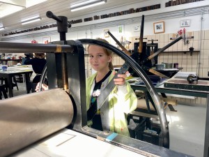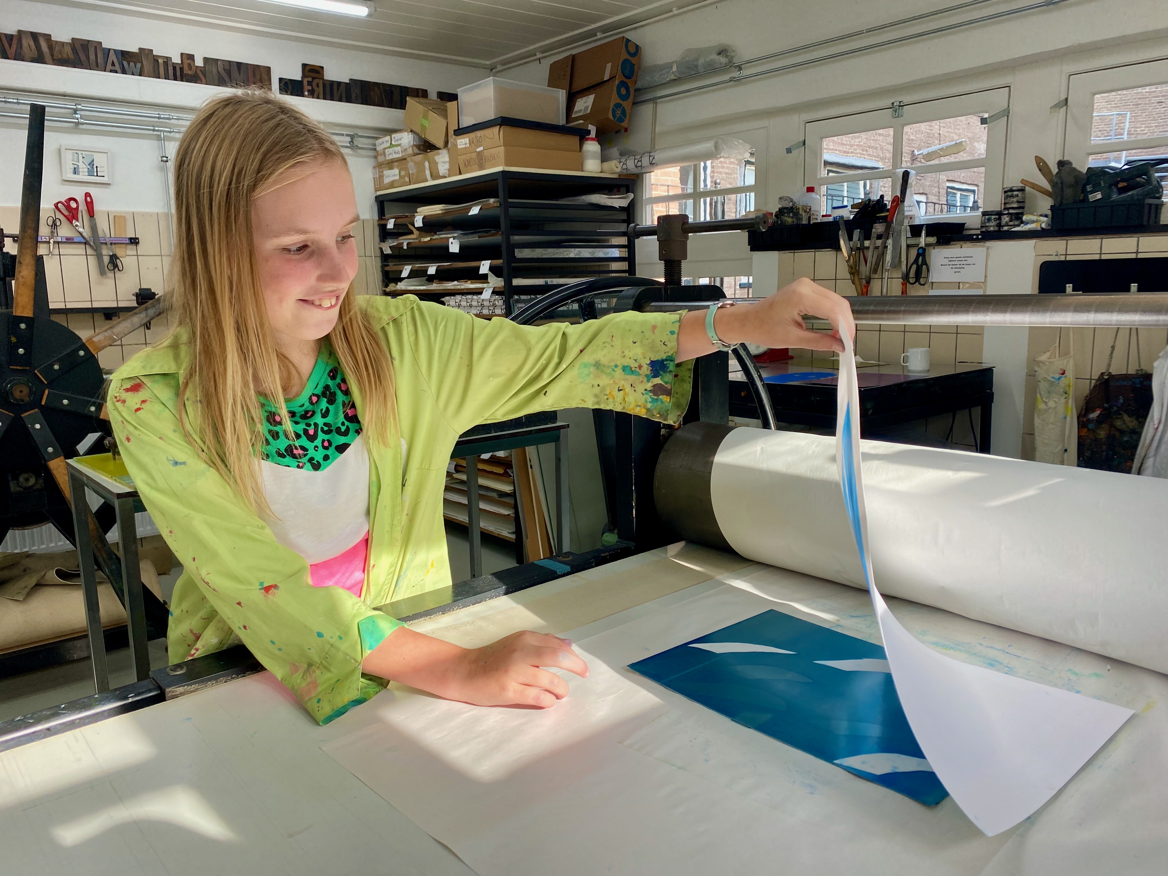 Met ingespannen gezicht draait mijn oudste dochter aan het wiel van de drukpers. Een grote glimlach verschijnt op haar lippen als ze even later het papier van de metalen plaat met inkt tilt. Haar monoprint is nog mooier geworden dan ze al hoopte. In niets is nog het meisje te herkennen dat zich aan het begin van de workshop voorstelde met haar naam en de aanvulling: ‘En ik heb hier geen zin in.’