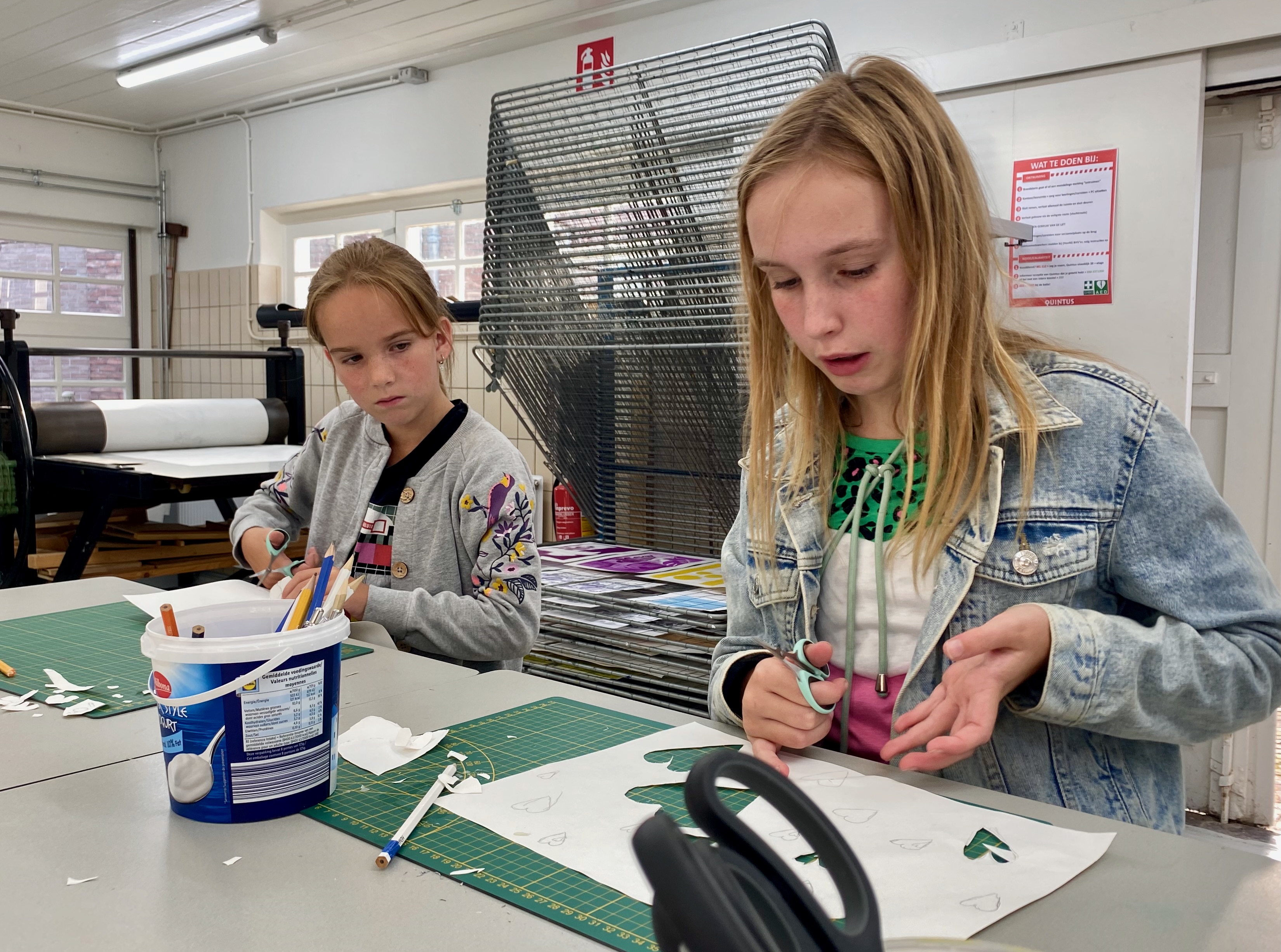 Ik heb ons drieën ingeschreven voor een ochtend in de grafiekwerkplaats van het culturele centrum in onze stad. ‘Maar wat gaan we dan dóén?’ wilden de meiden vooraf weten. Ik kon het ze niet zeggen. Iets met inkt en grafische technieken, maar aan die boodschap hadden ze helemaal niets. Het kostte me dan ook moeite om ze vanmorgen op de fiets te krijgen.