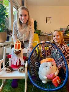Wat ook leuk is, is de Sinterklaasintocht. Vanmorgen kwam hij zowel aan bij ons in de stad als op de televisie. Gezien de vermoeidheid van de meiden leek het me beter om thuis te blijven en gelukkig gingen ze daarmee akkoord. Op het tafeltje stonden ranja en kruidnoten, in de stoelen zaten hun tot Sint en Piet verklede knuffels en op de bank zaten wij – precies op tijd voor de intocht.