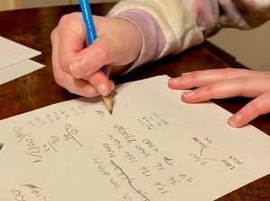 We zitten naast elkaar aan tafel, elk met ons schoolwerk. Zij maakt de rekensommen die morgen af moeten zijn, ik bereid mijn lessen Nederlands voor. Omdat ze meer uitdaging aankan, moet mijn meisje plusopdrachten maken. Die blijken af en toe nog knap ingewikkeld. Zo moet ze breuken vermenigvuldigen, percentages vaststellen en snelheden omrekenen.