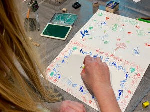 Nog voor de workshop is begonnen, zitten de meiden al over de tafel gebogen, op zoek naar de mooiste stempels. Ze verzamelen de letters van hun namen en afbeeldingen van vlinders en eekhoorns. Mijn jongste draait zich verrukt naar me om. ‘Misschien kun je hier wel een verhaaltje over schrijven, mam!’ stelt ze voor.