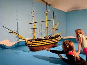 De tentoonstelling behandelt vier thema’s: lucht, land, zee en ruimte. Daar hebben de meiden geen boodschap aan. Ze gaan van de Titanic (200.000 steentjes!) naar de Saturnus 5-raket (3 meter hoog!) en via de Formule 1-auto’s (gaaf!) naar de Boeing 747 van de KLM (wat veel raampjes!).