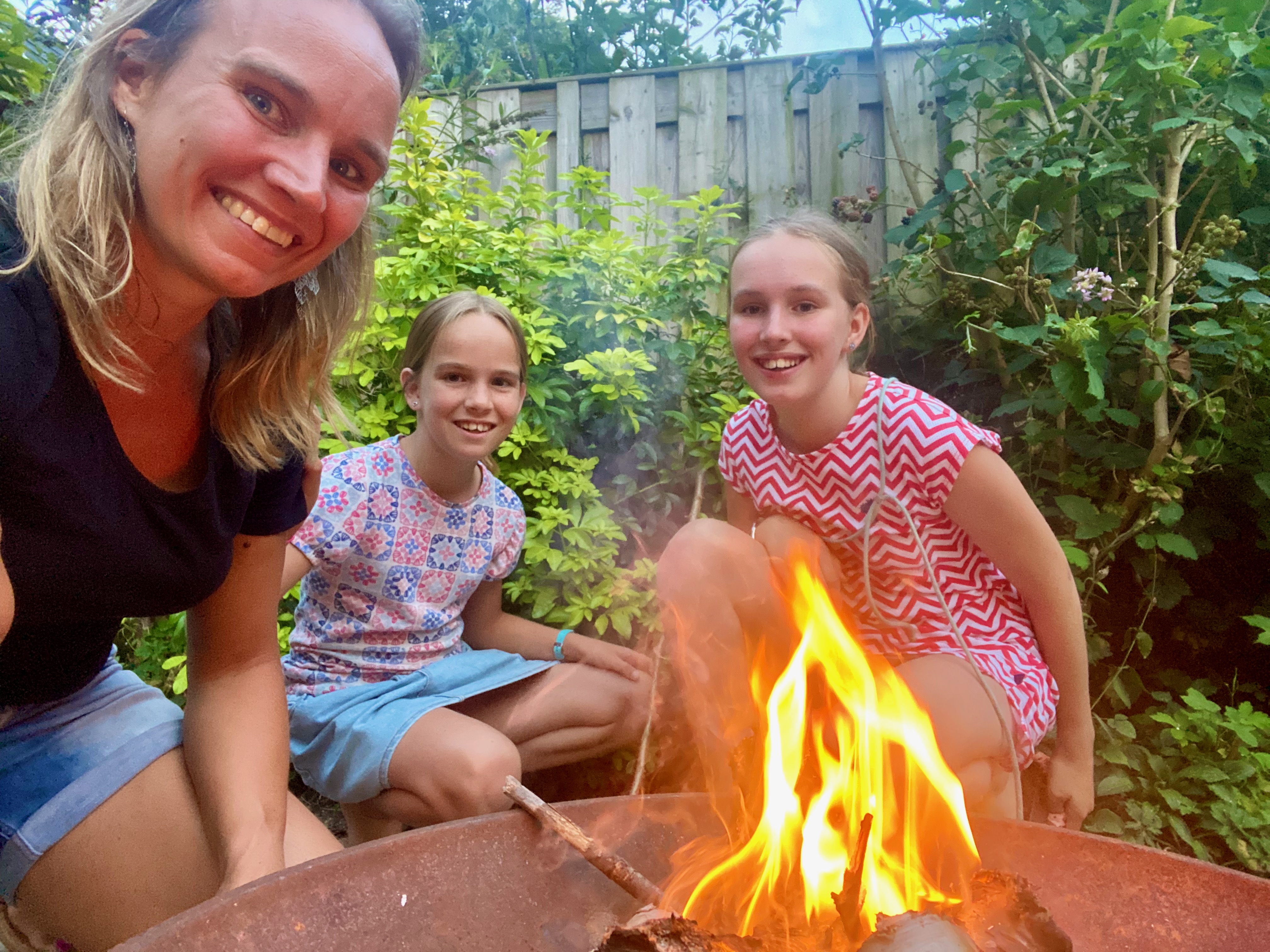 Langzaamaan werd het later. Het hout raakte opgebrand, de vlammen werden kleiner en de vermoeidheid sloeg toe. De meiden kwamen dichter bij me zitten, de jongste zit nu zelfs bij mij op schoot. Ze kan amper nog wakker blijven. Ik kijk naar mijn schatten, naar de flonkerende lichtjes in hun ogen, en voel me gelukkig. Mezelf kennende kan het nog wel even duren voor er weer vuur komt, maar deze avond krijgt zeker een vervolg.