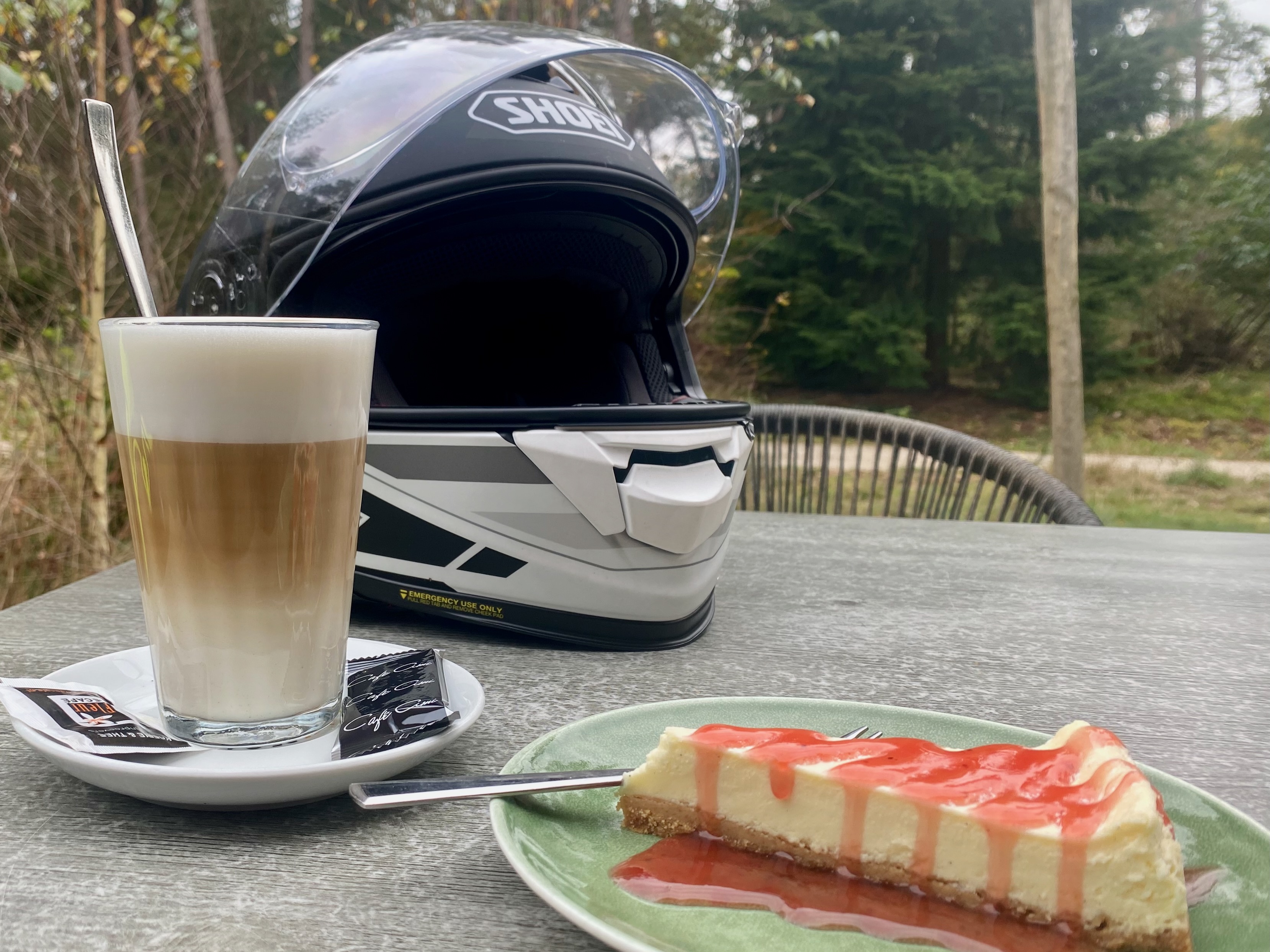 Net na Nijverdal, vlak voor ik richting de Holterberg ga, tref ik een grote parkeerplaats. Tussen de heidevelden en de bossen liggen wandelroutes, maar je kunt er ook koffie krijgen. Tevreden kijk ik even later naar de latte macchiato, de cheesecake en mijn helm op het tafeltje. Doel twee behaald!