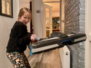 Nu zijn we alledrie druk bezig. Vanaf het aanrecht zie ik hoe mijn meisje de strijd aangaat met snoer, slang en zuiger. Het duurt even voor ze de slag te pakken heeft. Ook wanneer ze het apparaat soepeler door de kamer beweegt blijft ze moeilijk kijken, ze is duidelijk nog geen vrienden met de stofzuiger. ‘Mam, waarom had je niet gezegd dat dit zo moeilijk is? Mag ik de volgende keer een ander klusje?’