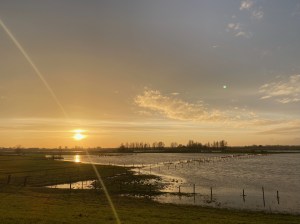 En dus zit ik nu op de motor. Ik verruil de bosrijke omgeving voor de uitgestrektheid van de IJssel en haar uiterwaarden. De zon begint langzaam te zakken en weerspiegelt op het water. Ik stap af en neem de tijd om rond te kijken. In de lucht hangen slechts een paar wolkenslierten en het landschap is prachtig. Het zou best kunnen dat ik over een paar dagen weer ziek ben, maar nu gelukkig nog even niet.