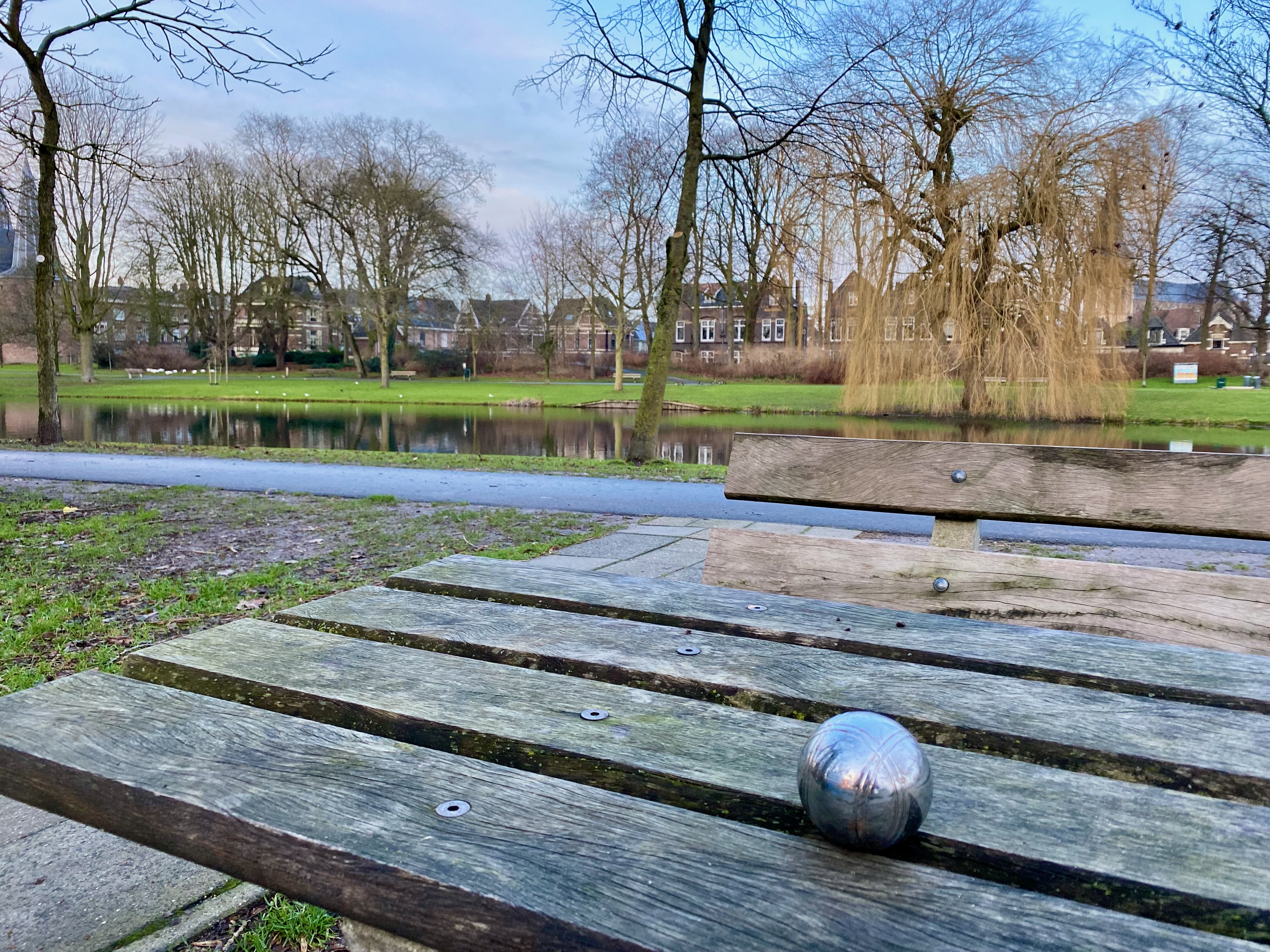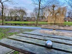 De visstukjes spetterden in de olie en ik keek naar de picknickbank bij de kraam. Daar lag één jeu de boulesbal op. Glimmend lag hij te wachten op zijn eigenaar. Had hij ogen gehad, dan had hij vast van het uitzicht op de vijver genoten. Hoe zou je zo’n bal nou kunnen vergeten? vroeg ik me nog net niet hardop af.
