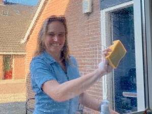 Ik neem de kozijnen af en zeep de ramen in. Ik spoel ze schoon en haal de wisser eroverheen. Streeploos drogen blijkt nog een behoorlijke uitdaging, maar het gaat me best aardig af. Tevreden kijk ik even later door de ruiten. Van déze kant kun je er in ieder geval weer doorheen kijken. Daarna valt mijn blik op de voordeur. Nee hè, daar moet ook nodig een doekje overheen.