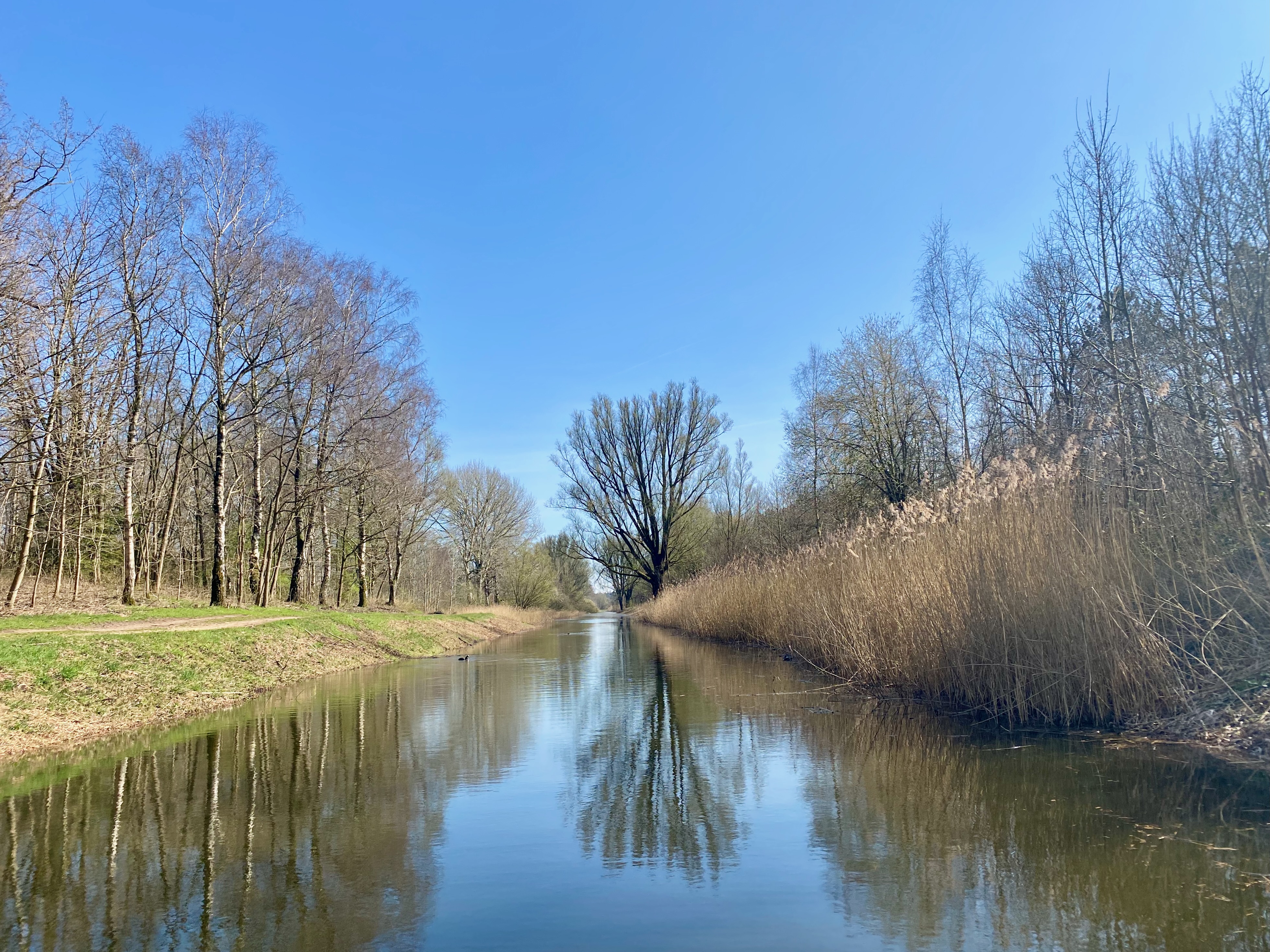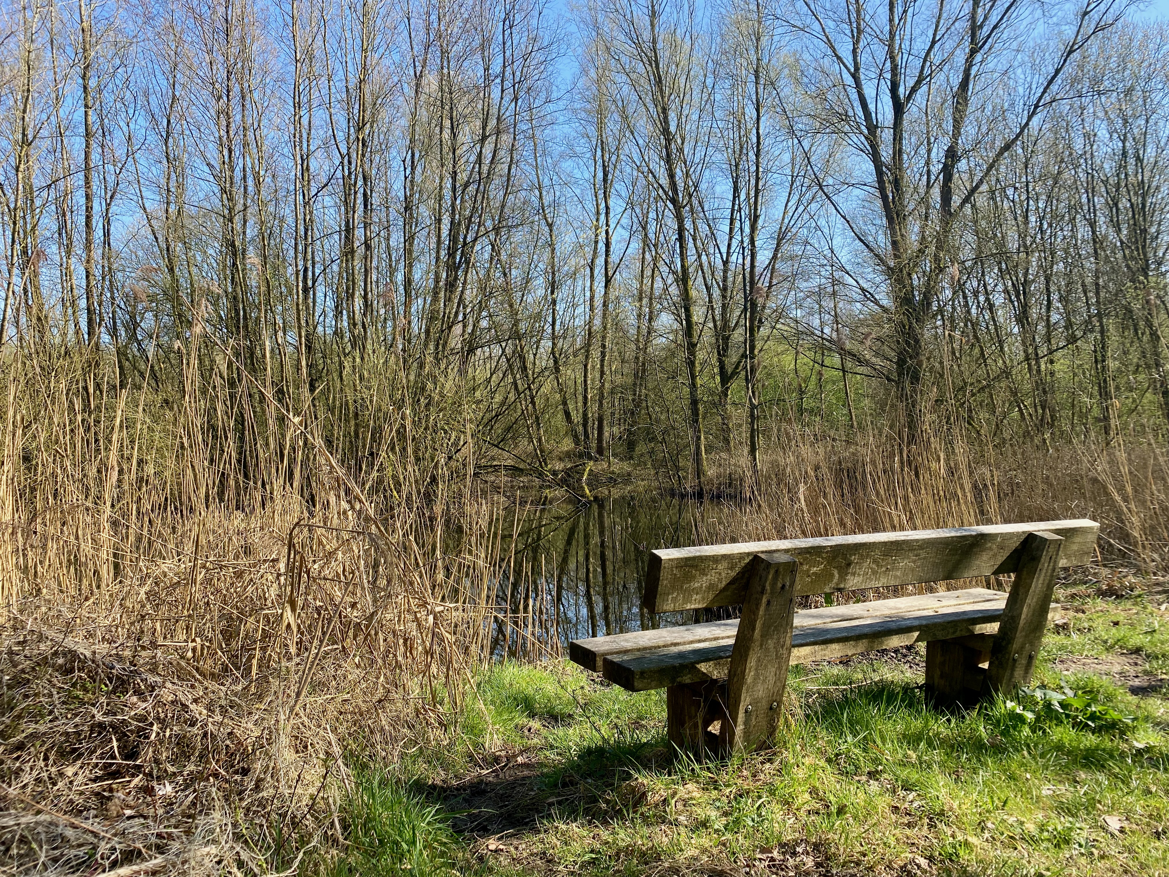 Met de gele route blijkt niks mis. Hier en daar is het misschien wat zanderig, verder kan ik gewoon doorlopen. Ook het stukje ná de route lijkt goed te gaan. Het bos is minder groen dat ik had verwacht, maar dat zal wel een vergissing van mijn gedachten zijn. Dat de zon vandaag schijnt, betekent natuurlijk niet dat het ook meteen zomer ís.