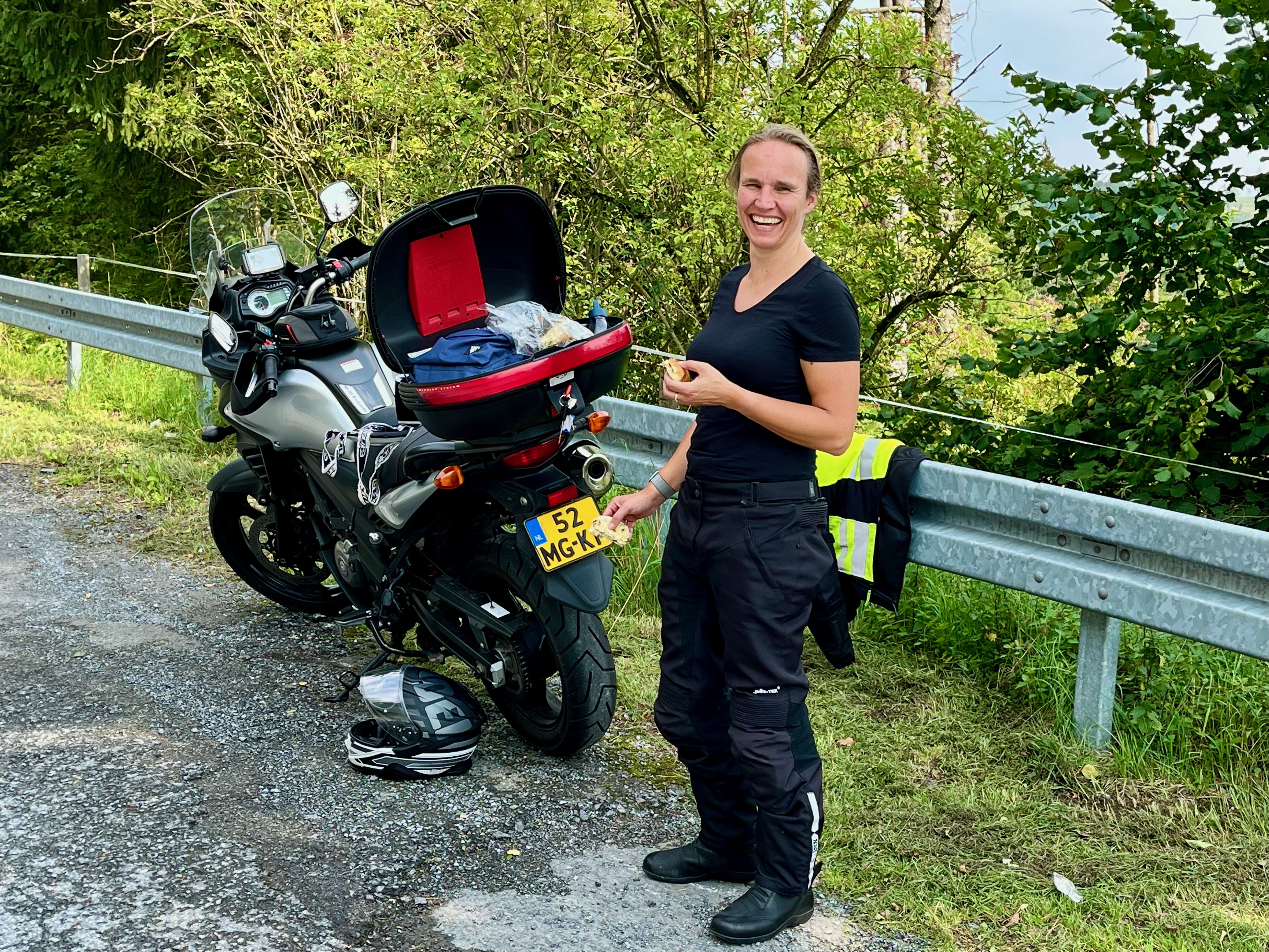 Mijn lief, die al bijna heel Europa vanaf de motor gezien heeft, stemt zijn tempo gelukkig af op het mijne. Meestal rijdt hij voorop, maar hij laat mij ook geregeld voor gaan. Het is even wennen om niemand te kunnen volgen, om de route zelf van de TomTom af te lezen, maar het geeft ook een gevoel van vrijheid. Daarnaast is het heel fijn om hem in mijn spiegels te zien.