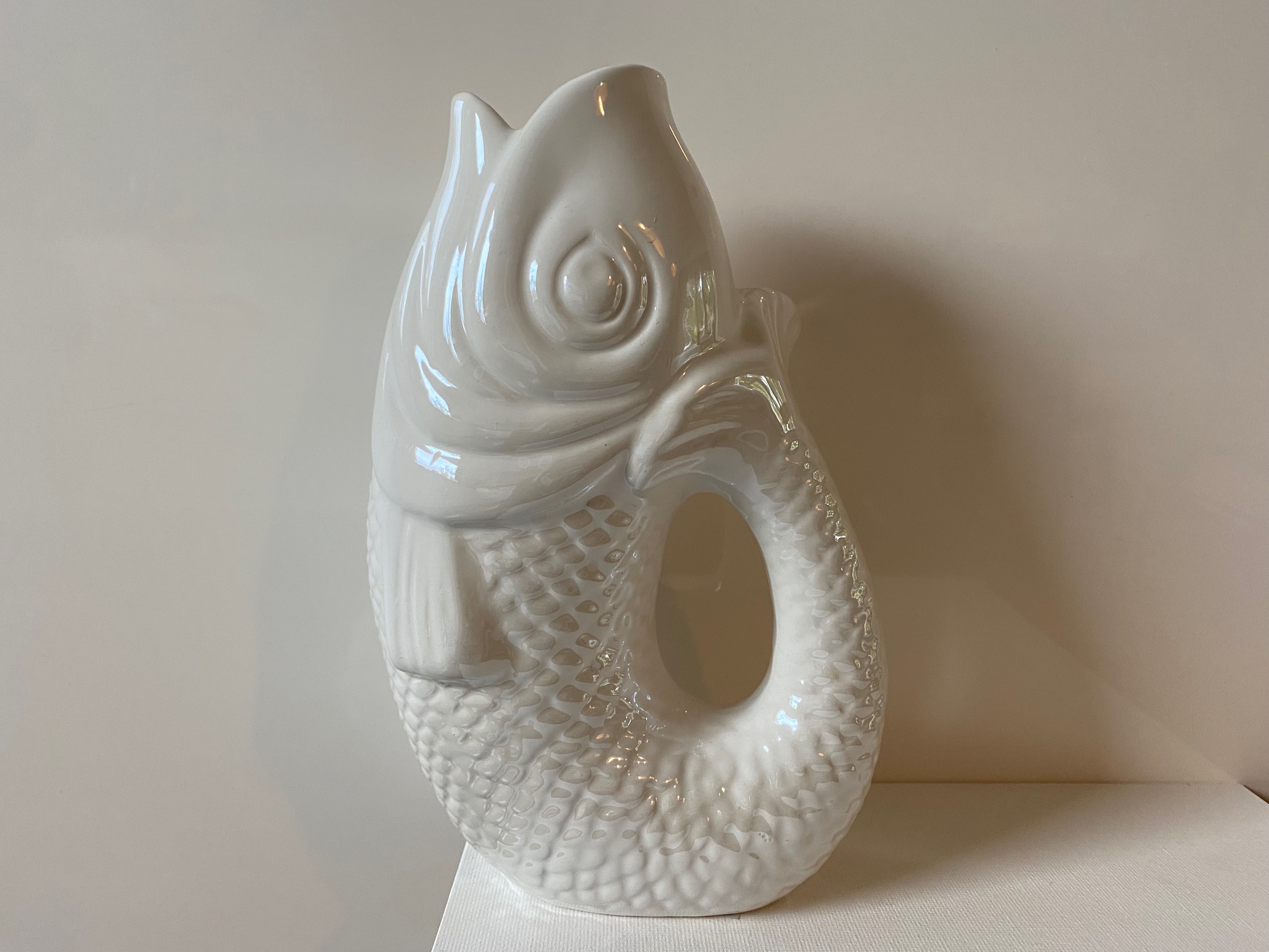 Ik eigenlijk ook niet. Mijn huis staat al vol met spullen en prullen, ik wil helemaal niets nieuws. Maar toen ik bij de woonwinkel was om mijn nieuwe zoldergordijnen op te halen, straalde deze vis me vanaf de opruimingsplank tegemoet. ‘Koop mij!’ riep hij. Even twijfelde ik, al gauw was ik om en gaf ik gehoor aan zijn roepen.