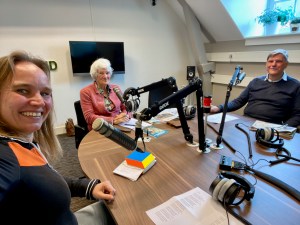 Op het blaadje dat voor me ligt heb ik ‘rust’ geschreven, om mezelf eraan te herinneren niet te snel te praten. Af en toe werp ik er een blik op. Ik hoop dat ik, ondanks mijn enthousiasme, goed te volgen ben. Die gedachte duurt echter maar even, ik vind het vooral leuk. De kleinschaligheid spreekt me aan. Wij met zijn drieën achter de microfoons, de technicus aan de andere kant van het glas achter de knoppen en de luchtige sfeer van het gesprek.